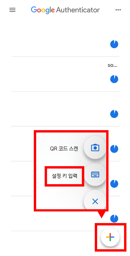 5. 구글 OTP 앱을 열어 하단 [+] 버튼을 눌러, [설정 키 입력] 을 눌러주세요.