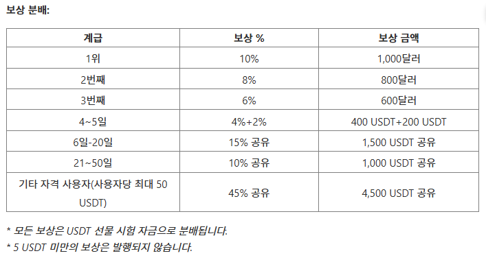 - 이벤트 기간 동안 누적 선물 거래량이 5,000 USDT 이상입니다.